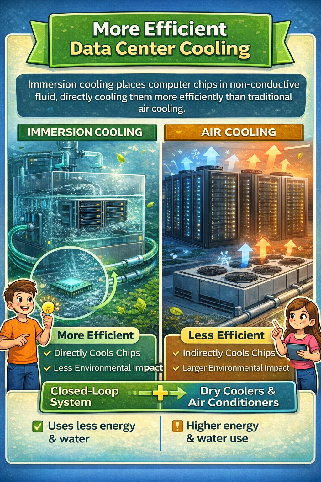 Exploring other, more efficient methods of cooling, including methods like immersion cooling, and amounts of air cooling can be helpful things to implement in the effort of making data centers as environmentally friendly as possible. Immersion cooling is a method of cooling where a chip is placed in a non conductive fluid which directly cools the chip. This allows for direct cooling of chips, which is more efficient than the traditional way of liquid cooling, the higher efficiency meaning less material has to be used, resulting in a lower environmental effect, and according to Forbes immersion cooling is an approach which will reduce environmental harm. This solution is one of the easier ones to implement, considering it’s the only solution which doesn’t require drastic change in the culture around AI, or the uprooting of the infrastructure, but rather only a change in systems. Immersion cooling can also lead to a more closed loop system, leading to less overall consumption, and leading to less costs for companies, which is in their best interests.